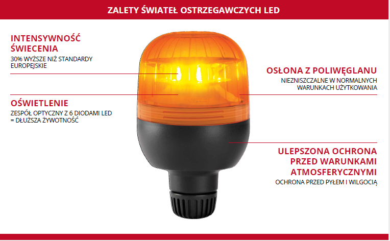 Światło migające Case IH składa się z zespołu diod, które zapewniają optymalny rozsył wiązki światła i odpowiednią widoczność. Test wykazują, że światła ostrzegawcze Case IH emitują 30% więcej światła niż wymagają normy europejskie.